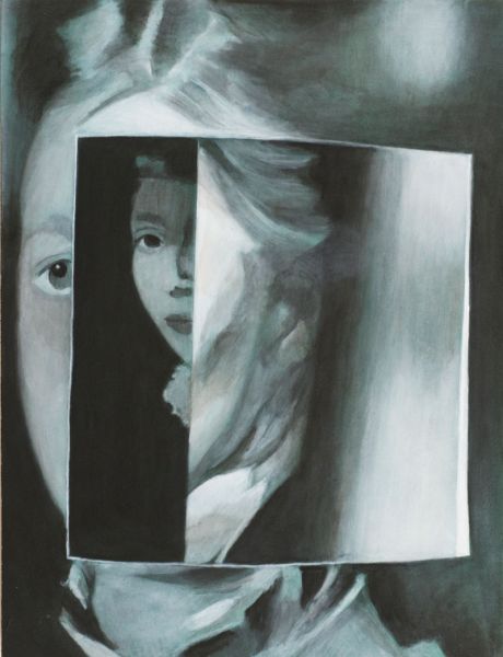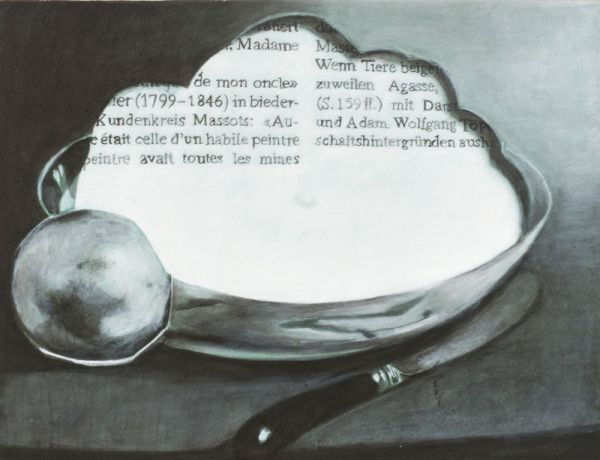 Dieser Werkgruppe liegt ein im Brockenhaus gefundener Katalog der Stiftung Oskar Reinhart Winterthur zugrunde. Die Bilder sind Zeugen der Zeit, einige etabliert und berühmt, andere klein und unscheinbar. Allesamt gesammelte Originale, fotografiert und im Buch nach Alphabet sortiert und verewigt. Text und Bild wechseln sich ab. Welches Bild auf das nächste folgt hängt vom Namen des Schöpfers ab. Die Geschichten hinter den Bildern und diejenigen, die erzählt werden sind mannigfaltig und treffen im Buch jäh aufeinander. Mit dem Messer öffne ich die Seiten und auch die Bilder. Die so enstehenden Durchblicke male ich als neues Original und lasse die Geschichten in neuen Räumen verschmelzen.
