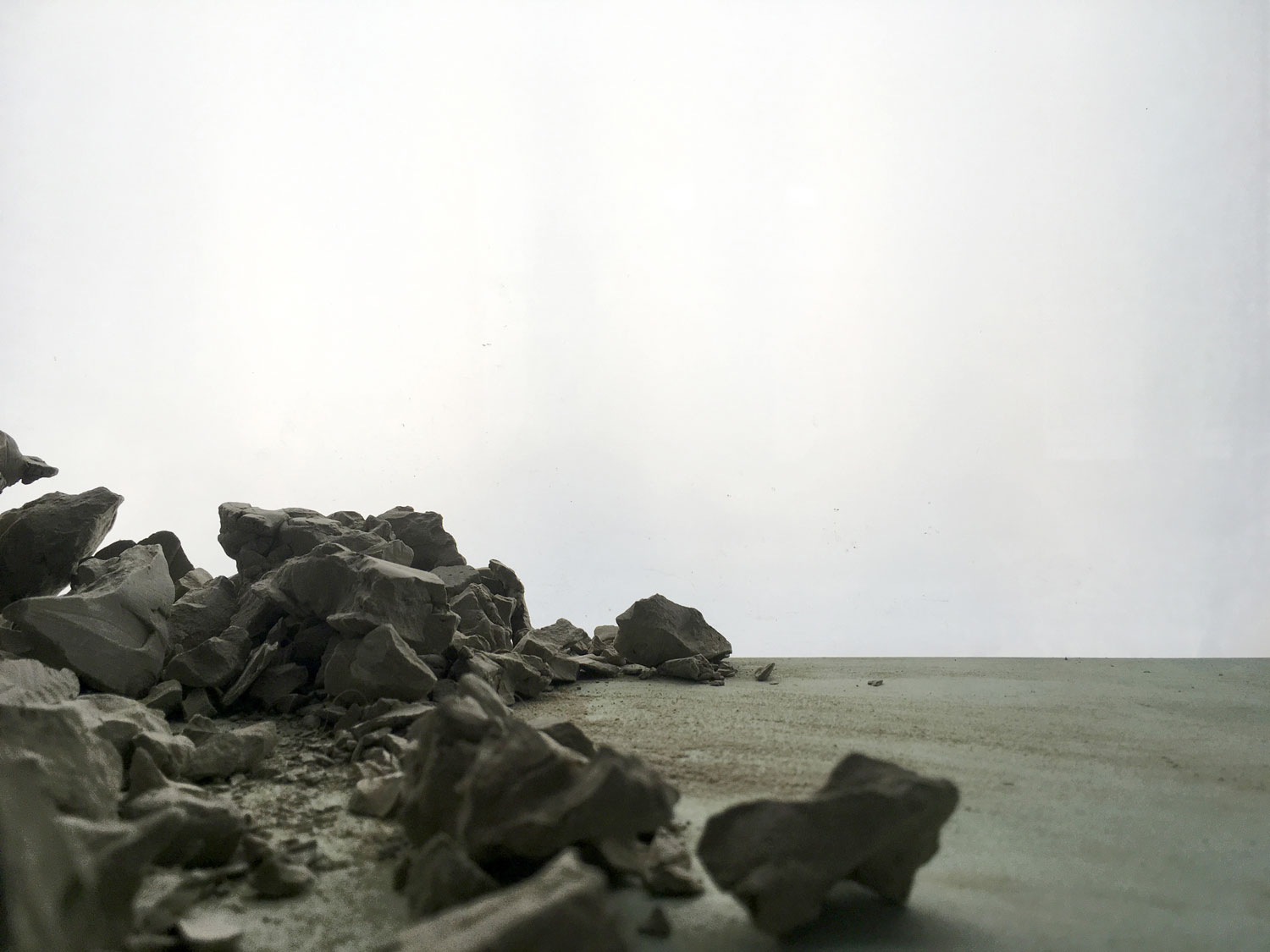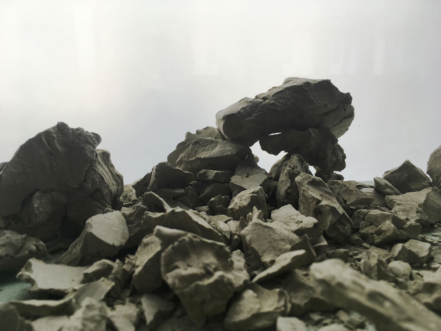 Mit Bruchstücken von Tonskizzen, grundierten Holzplatten und Kartonfundstücken habe ich verschiedene Situationen arrangiert und mit der Smartphone-Kamera im Bild fixiert. Das Spielfeld ist gegeben durch den Arbeitstisch und das als Hintergrundfläche dienende Leuchtpult, das gleichzeitig auch als Lichtquelle fungiert. Im Zentrum der Arbeit steht die Freude am Spiel mit Fund- und Abfallmaterialien, die durch ihr jeweiliges Arrangement, die Wahl des Blickwinkels und die dadurch entstehende Veränderung der Dimensionen und Lichtverhältnisse, als unterschiedliche Landschaftselemente gelesen werden.